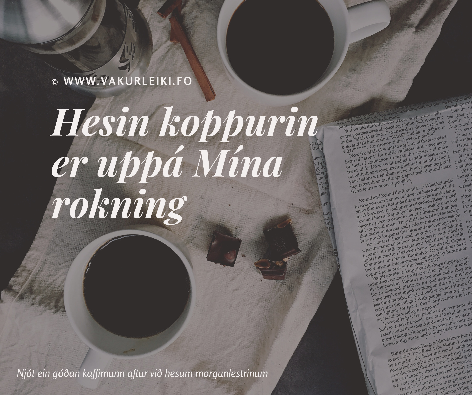 “Góðan morgun!” Ljóðaði tað, sum eg lat køkshurðina upp. Eg var ikki heilt vaknað og møgin tyngdi ryggin. Eg gløddi, at myrkinum uttanfyri vindeygað. Enn ein myrkur morgun, og eg leit aftur á gjárdagin.